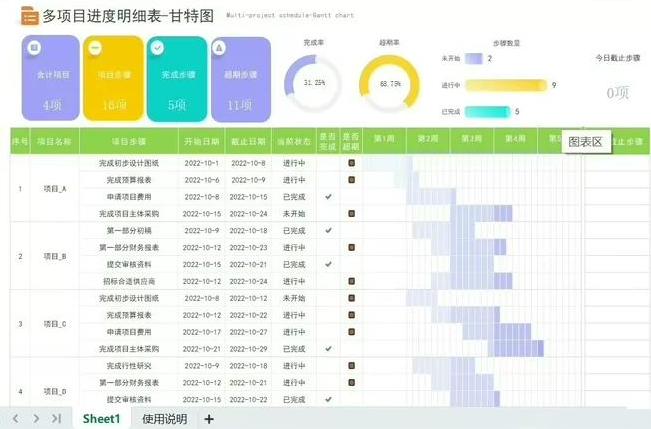 可以手动列出多项目,多阶段或里程碑的起止时间和标注完成状态,自动统计所有项目的任务项完成情况。