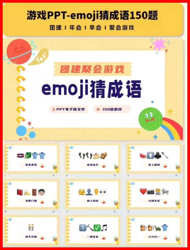 150道emoji猜成语PPT游戏 高清PPT源文件,支持二次编辑