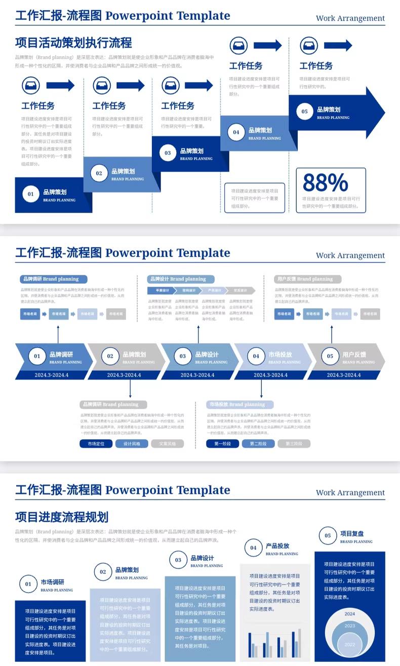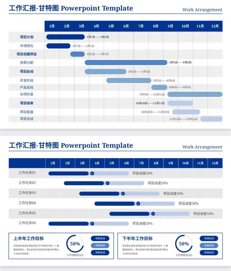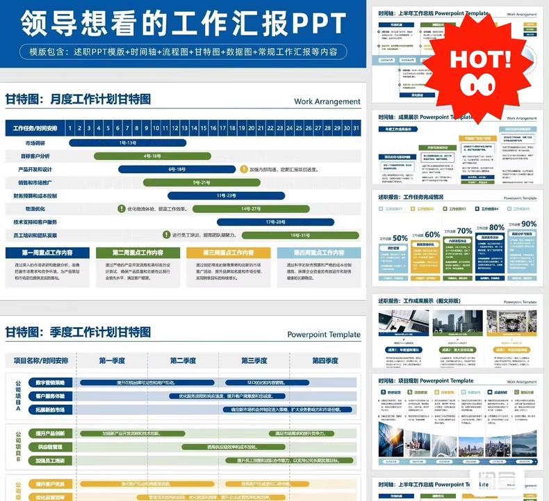 200多页海量内容,覆盖成果展示、工作规划、数据图表、甘特图、时间轴、流程图等全场景,直接套用不用费心。