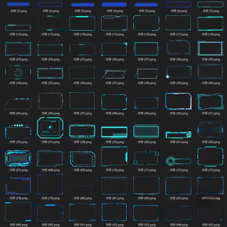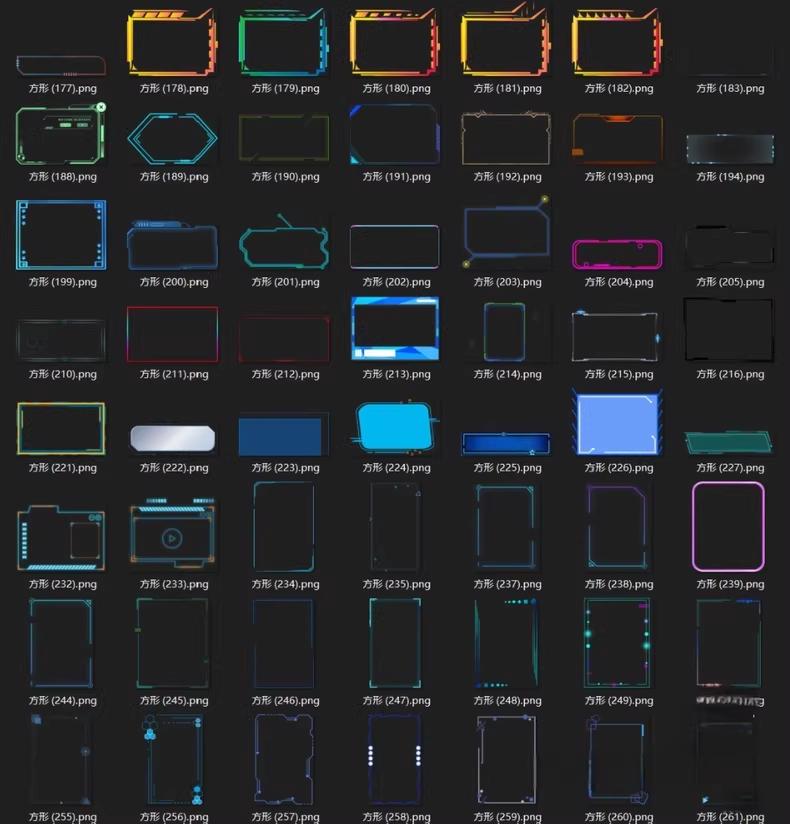 样式炸场:圆形能量环、方形全息框、异形未来界面…覆盖电路纹理、霓虹渐变、赛博线条,从极简光边到复杂机械结构,连全息投影、数据信息流边框都有;