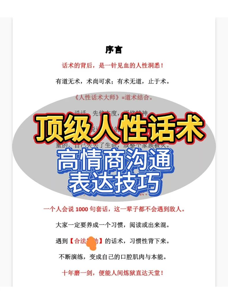 这套人性话术大师资料,带你看透沟通背后的人性逻辑,道术结合,让你在人际交往、职场沟通、销售场景中从容应对,少走弯路。
